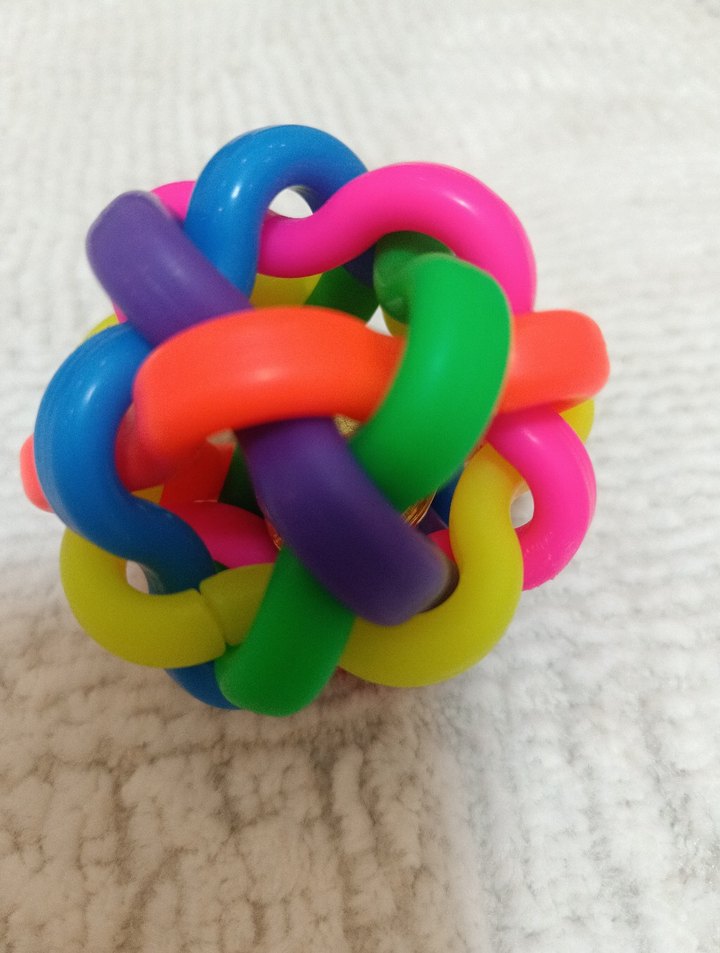 Birbirine geçmiş çok renkli halkalardan oluşan, kediler için duyusal uyarım ve rahatlama sağlayan diş kaşıyıcı top