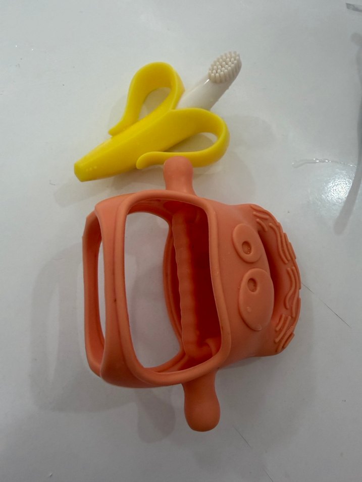 Renkli, yumuşak malzemeden yapılmış diş kaşıyıcı ve muz şeklinde diş fırçası seti, bebeklerin diş etlerini rahatlatır ve ağız bakımı sağlar.