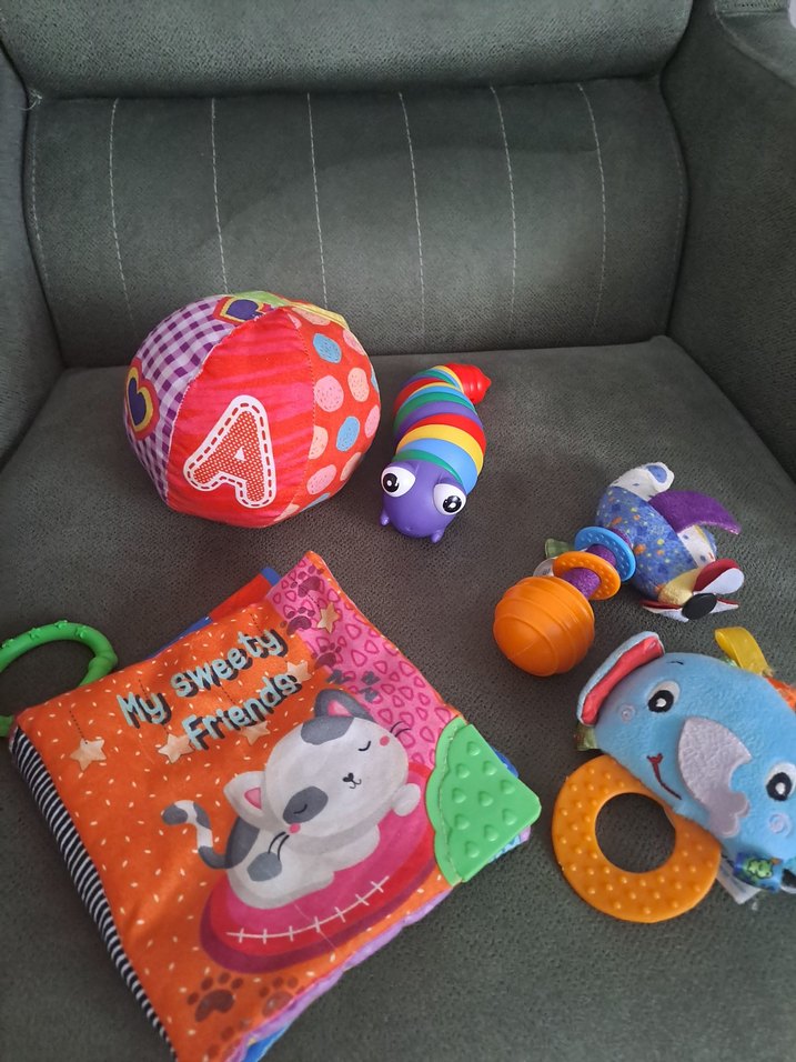 Renkli yumuşak top, tırtıl, fil ve 'sweety' yazılı kumaş kitap içeren diş kaşıyıcı ve oyuncak seti.