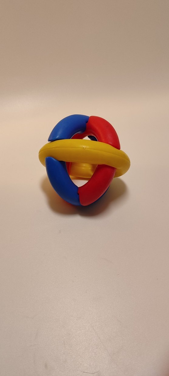 Kırmızı, mavi ve sarı parçaların birleşiminden oluşan renkli diş kaşıyıcı ve zil oyuncak.