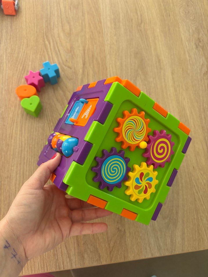 Bu renkli eğitici oyuncak küp, dönen dişliler ve şekil ayırma parçaları ile çocukların öğrenmesini destekler. Tertemiz çok verimli oyuncak. Sadece 1 şekil eksik.