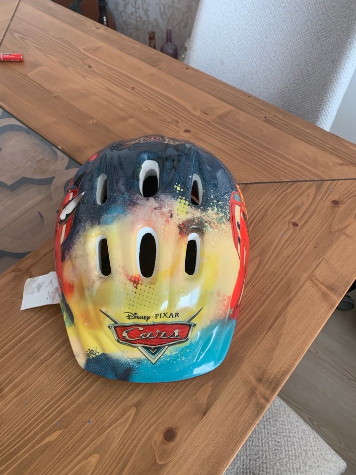 Renkli plastik biker kask, Disney Pixar Cars baskılı. Çoklu havalandırma delikleri ve tokalı kayışa sahip, rock punk havası taşıyor. ️ #kask#çocuk kaskı yıpranma mevcut fotoğrafta belirttiğim yerde yanma gibi soyulma olmuş
