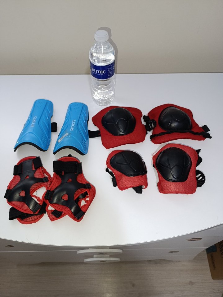 Renkli biker tarzı plastik diz koruyucuları ve Velcro bantlı uyumlu eldivenleri içeren koruma ve konfor seti. ️