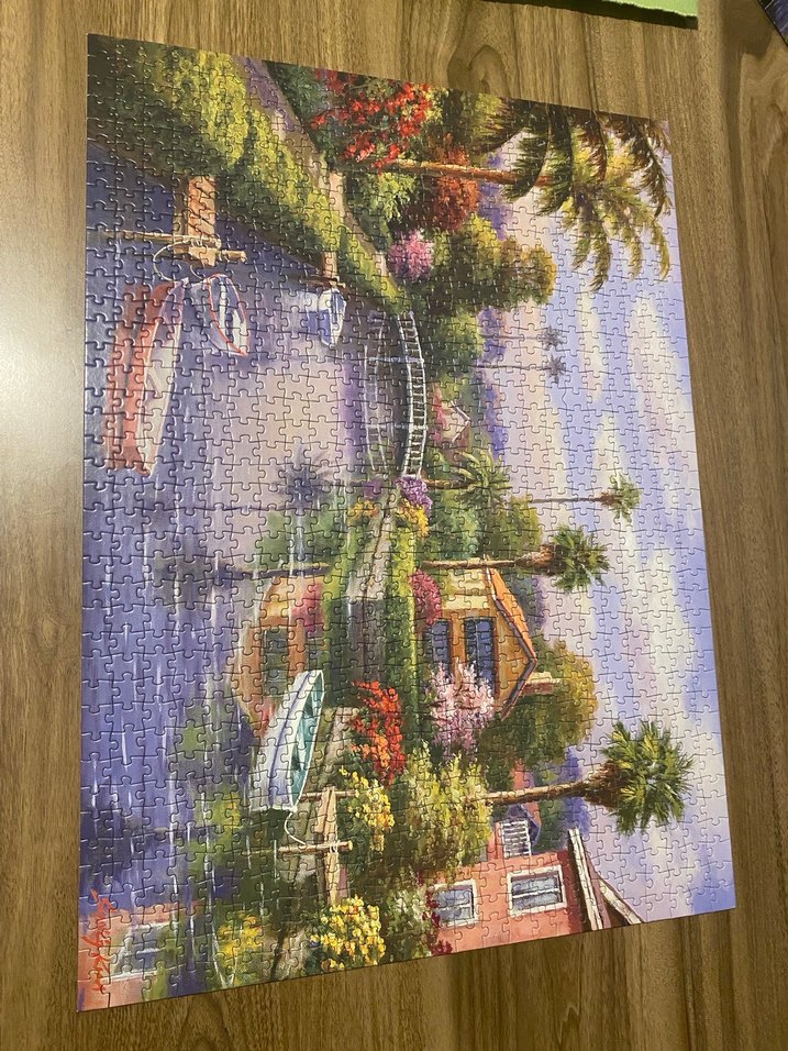 Bu puzzle, tekneler, köprü ve evlerin çevresinde ağaçlar ve çiçeklerle dolu canlı bir doğa manzarası sunar. Koyu ve parlak renkler içerir.