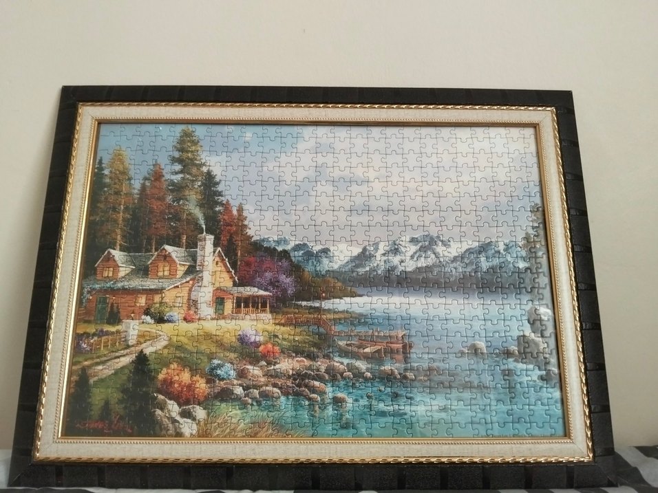 Bu puzzle, göl kenarında bir kulübe ve çevresindeki ağaçlar ile dağları içeren renkli bir doğa manzarası sunar. Detaylı ve huzurlu bir atmosfer sağlar.