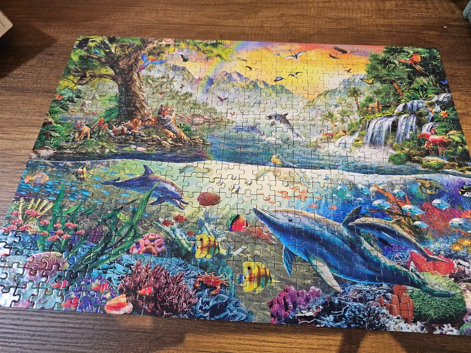 Renkli doğa temalı puzzle, su altı ve orman hayvanlarıyla dolu canlı bir sahne sunar.