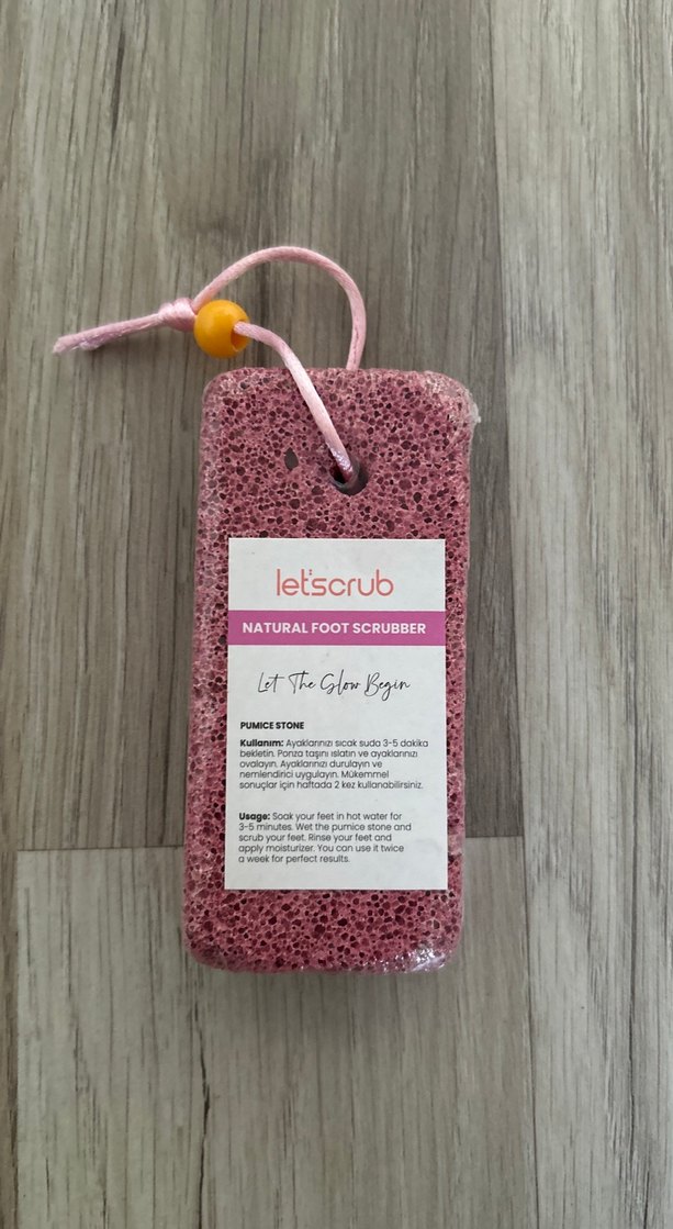 Pembe renkli doğal ayak peeling süngeri, ölü deriyi temizler ve ayakları yumuşatır. Pomza taşı dokusu ve asma ipi bulunur. Marka: let'scrub. Nasır sökücü taş