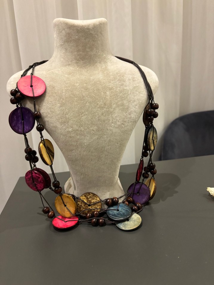Renkli doğal taş boncuklardan oluşan, bohem tarzda uzun kolye. Günlük kullanım için uygun, hippie ve retro havası taşıyor.
