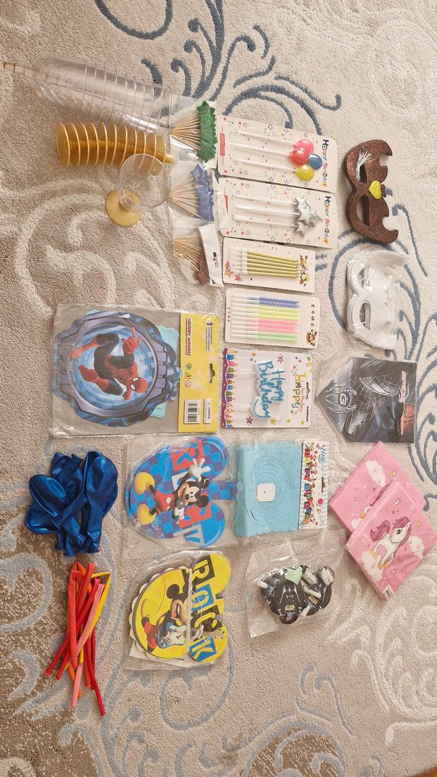 Doğum günü için renkli balonlar, mumlar, maskeler, bardaklar ve temalı süslemeler içeren parti seti.