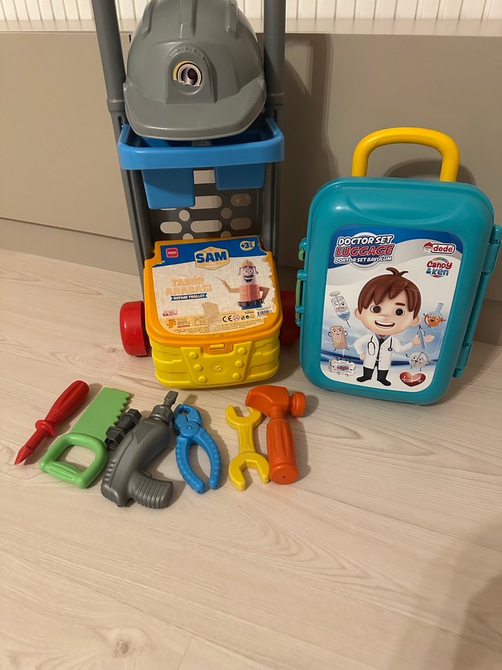 Renkli doktor çantası ve tamir seti, çeşitli plastik aletler, mavi valiz ve baret ile birlikte gelir. DOCTONST markalıdır.