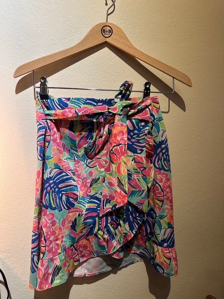 Renkli tie-dye desenli, dökümlü ve bol kesim mini etek. Sentetik kumaştan üretilmiştir, günlük kullanım için uygundur.