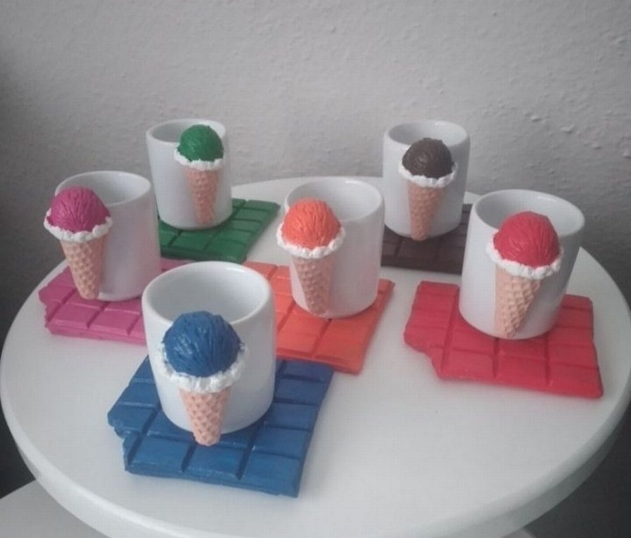 Renkli, 3D dondurma külahı detaylı kupalar ve uyumlu kare altlıklar seti.