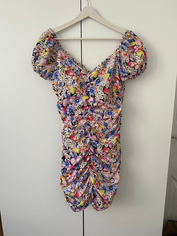 Renkli tie-dye desenli, drapeli ve v yaka kısa elbise. İnce askılı ve bohem tarzda, parti için uygun bir model.