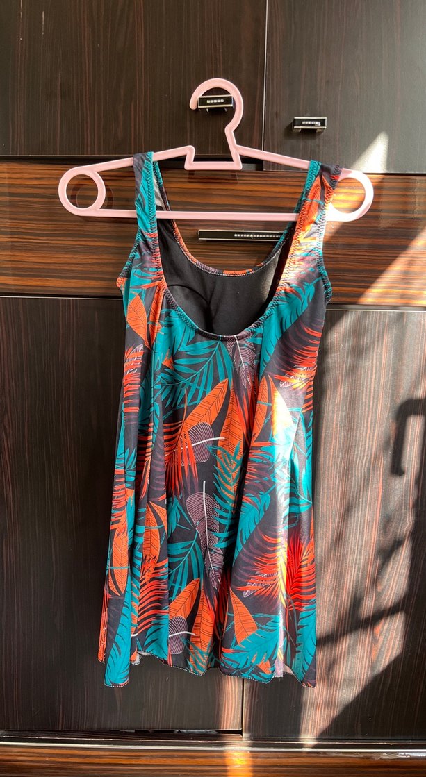 Renkli, kolsuz kadın mayo, uzun ve drapeli tasarımıyla dikkat çeker. Canlı batik desenleriyle plajda şık görünür.