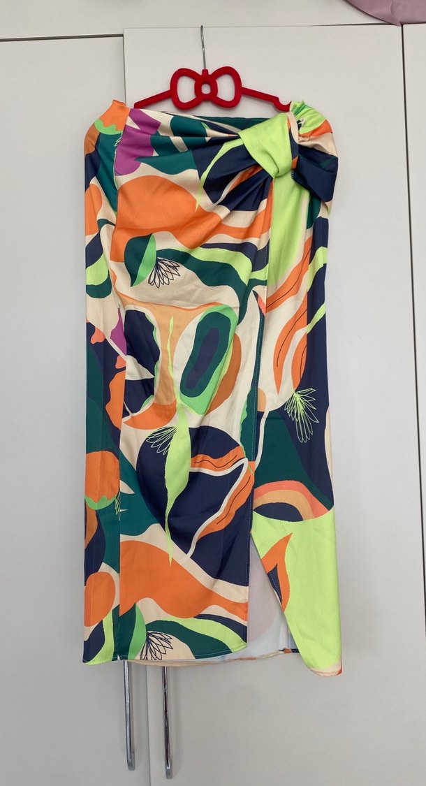 Renkli ve canlı tie-dye desenli, drapeli uzun kadın pareo. Kolsuz ve vücuda oturan kesimiyle modern ve avangart bir tarz sunar.