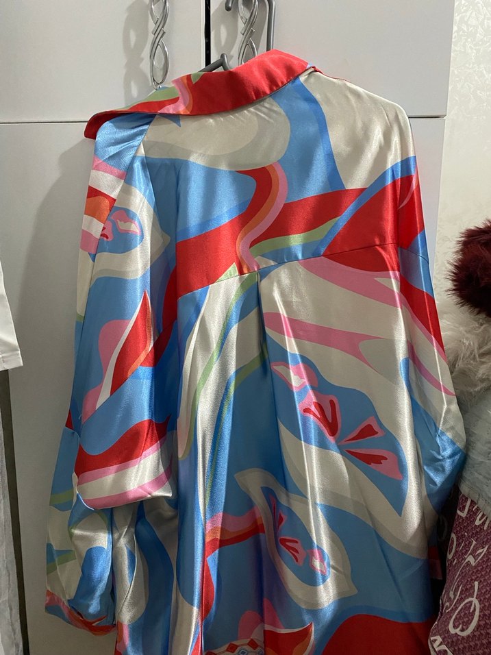 Kadın gömlek, uzun kollu ve bol kesim olup, drapeli tasarıma sahiptir. V yaka ve açık renkli çok renkli tie-dye deseni bulunur. Yumuşak sentetik kumaştan yapılmıştır, uzun boy ve çağdaş stilde, bohem ve avangart tarzlara uygundur.
