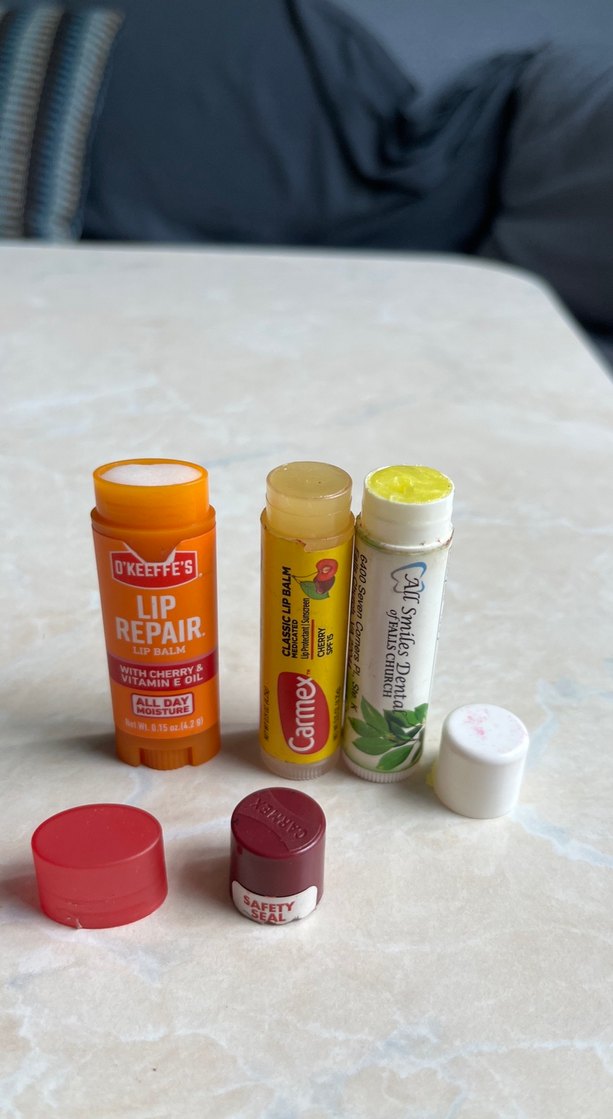 Kiraz ve E vitamini yağı içeren, dudakları nemlendiren ve onaran renkli üç dudak balmı seti.