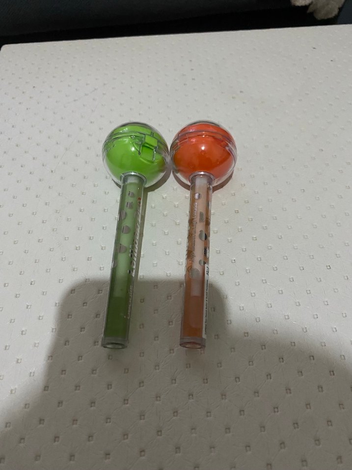 Yuvarlak kapaklı, canlı yeşil ve turuncu renklerde iki renkli dudak parlatıcısı seti.