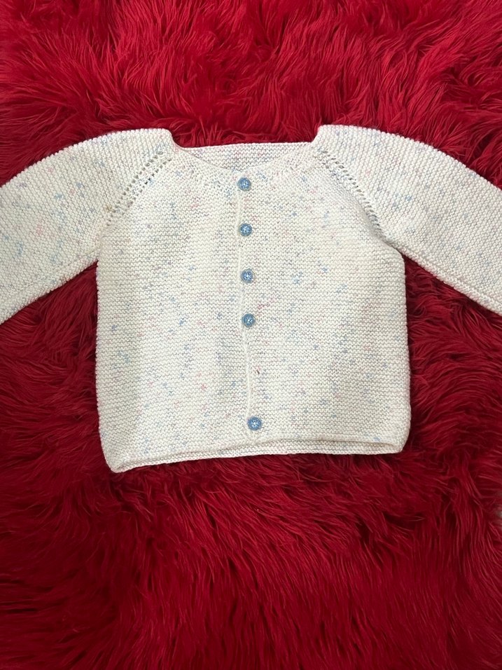 Vintage tarzda, uzun kollu, bol kesim beyaz örgü kız hırka. Renkli noktalar ve düğme detayları bulunur. (bir düğme eksik)