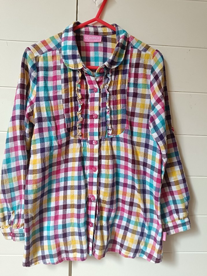 Renkli kare desenli, düğmeli, uzun kollu pamuklu gömlek. Bohem stil için normal boyda ve bol kesimdir.