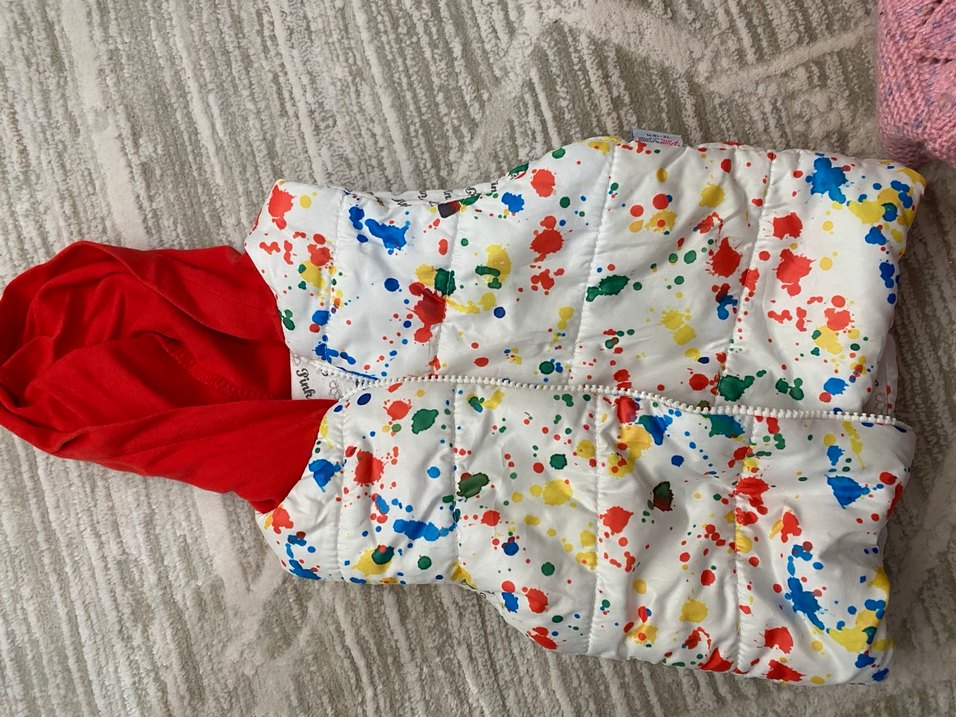 Bu renkli çocuk montu, fermuarşı ve tie-dye desenlidir, canlı renkler ve pop kültür tarzı sunar.
