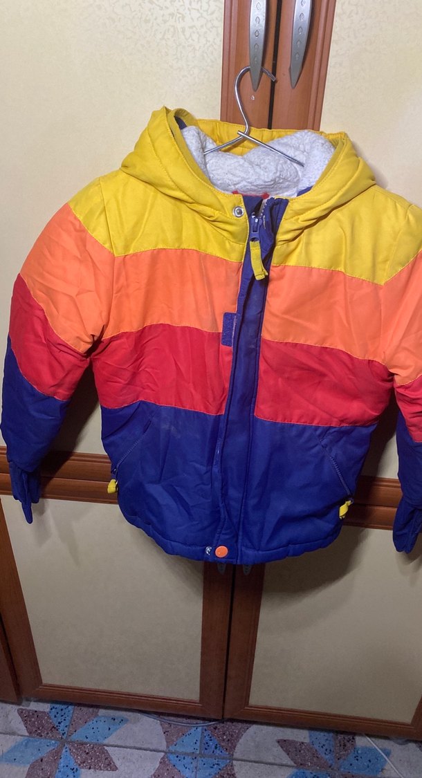 Düğmeli, fit kesim erkek çocuk montu, yumuşak ve sıcak kumaştan. Sarı, turuncu, kırmızı ve mavi renkli yatay şeritlerle sokak tarzı görünüme sahip.