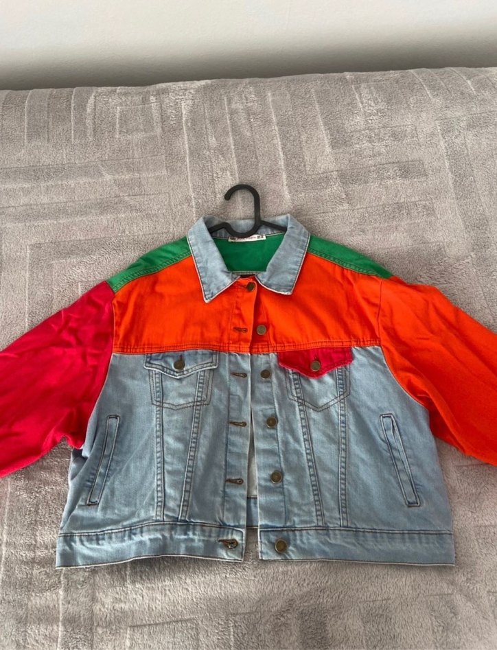 Kadınlar için düğmeli, uzun kollu, yakalı ve bol kesim denim ceket. Canlı renklerde tie-dye desenli, midi boy ve rahat sokak stili için uygun.