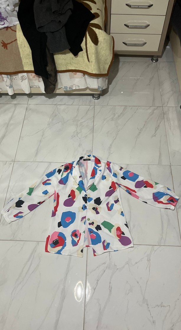 Renkli batik desenli, uzun kollu, düğmeli ve bol kesim kadın gömleği. Yakası çentikli, sentetik kumaştan, günlük rahat kullanım için uygun.