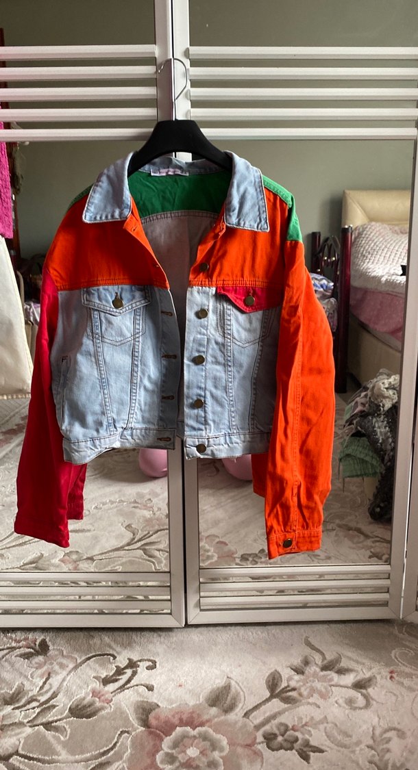 Salaş kesim, uzun kollu kadın kot ceket. Çok renkli, düğmeli ve tie-dye desenli sokak stili tasarım. Normal boyda ve günlük kullanıma uygun.