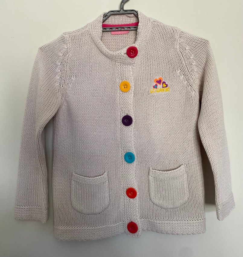 Rahat kesim kız hırka, uzun kollu ve renkli düğmelerle süslenmiştir. Örgü kumaştan olup nakış detayları ve ön cepleri vardır.
