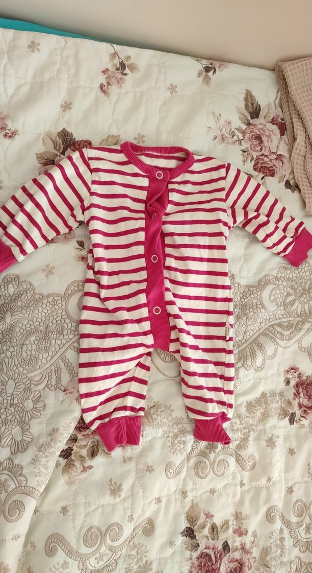 Renkli pembe, düğmeli ve çizgili desenli uzun kollu bebek tulumu. Cigit markadır.