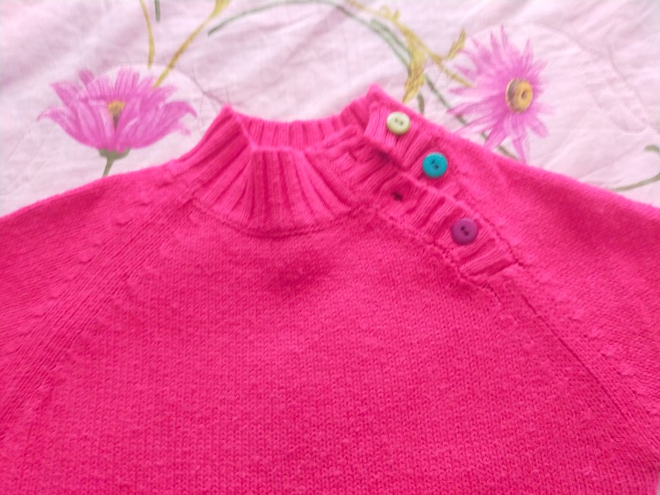 Pembe renkli, uzun kollu ve bol kesim kız kazak Renkli düğmelerle sade tasarıma hareket katıyor.