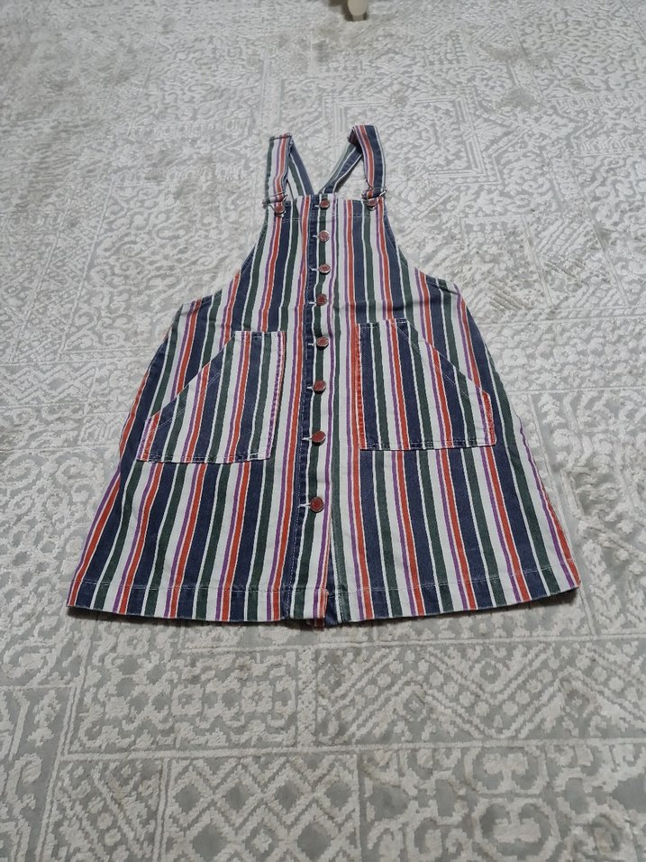 Renkli dikey çizgili, düğmeli kolsuz salopet. Yumuşak sentetik kumaştan, rahatlık için bol kesim.