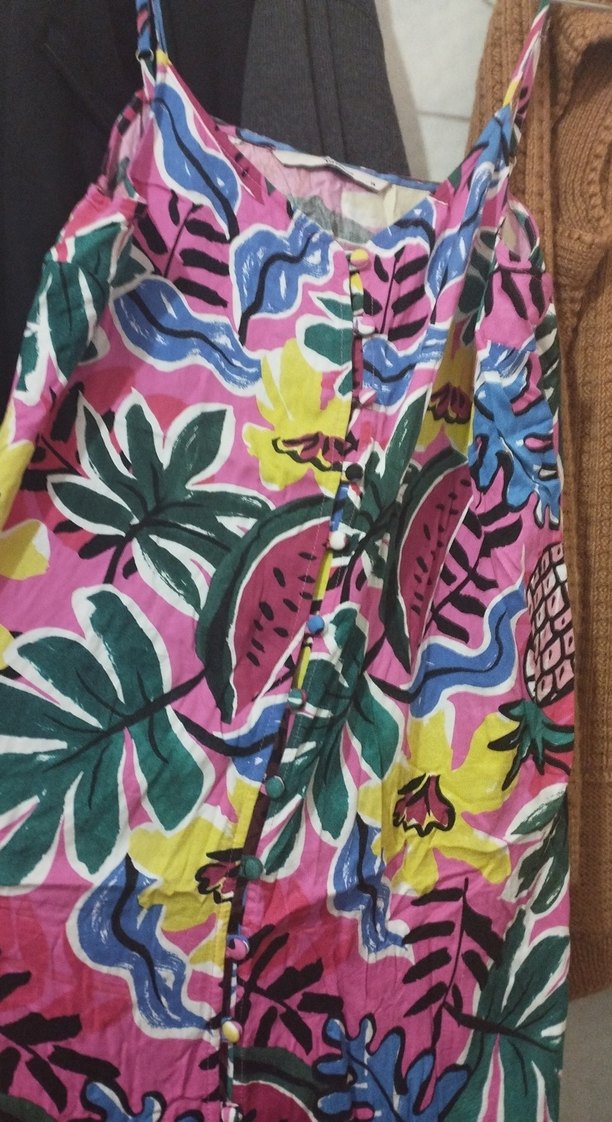 Renkli baskılı, düğmeli, askısız yaka ve salaş kesim kadın elbisesi. Sentetik kumaştan, uzun boylu ve kolsuz, bohem tarzını yansıtır. Günlük kullanım için uygundur.
