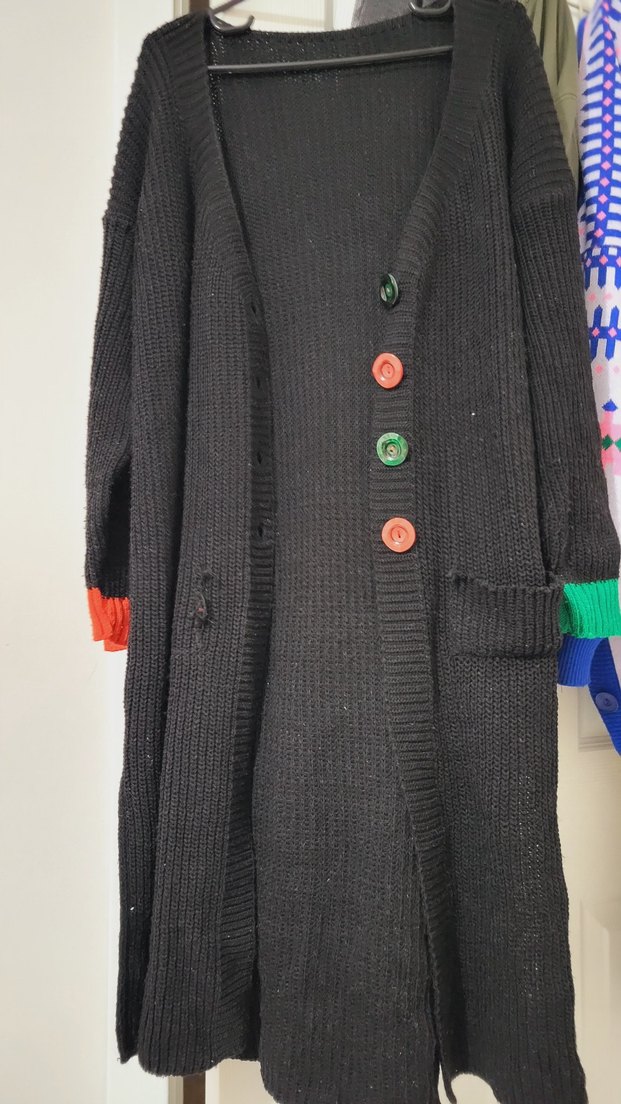 Renkli düğmeli ve yakalı uzun örgü kadın hırka. Salaş kesim, desenli ve rahat sokak stili için uygun.cebinin birini söktüm,digeride sökülecek