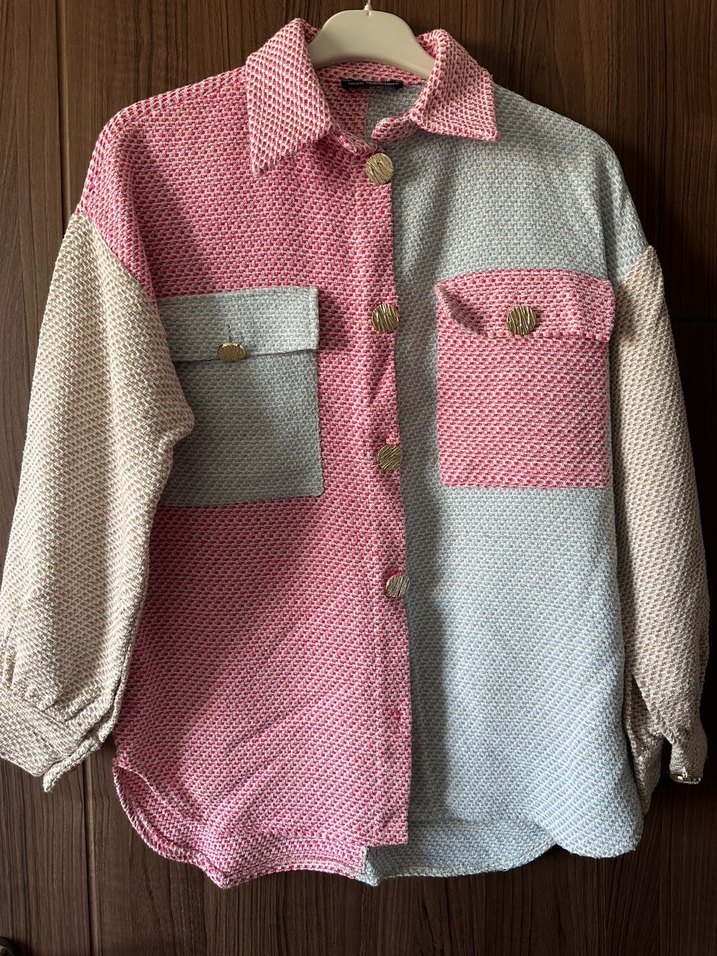 Rahat kesim, uzun kollu ve düğmeli kadın gömleği. Pastel çok renkli tie-dye desenli, yakası notched lapel tarzında, günlük kullanıma uygun.