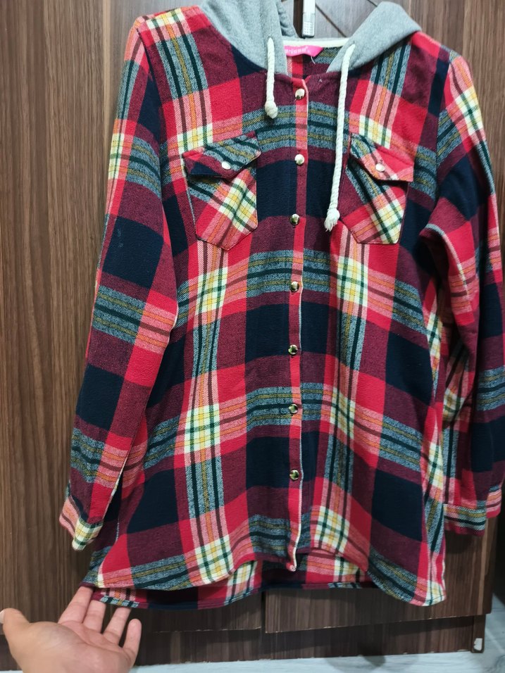 Renkli kareli desenli, düğmeli ve kapüşonlu uzun kollu salaş kadın gömlek. Rahat kesimi ve göğüs cepleri ile günlük kullanıma uygun. Az kullanıldı XL, Hesabımdan diğer ürünlere bakabilirsiniz pazarlık sünnettir.