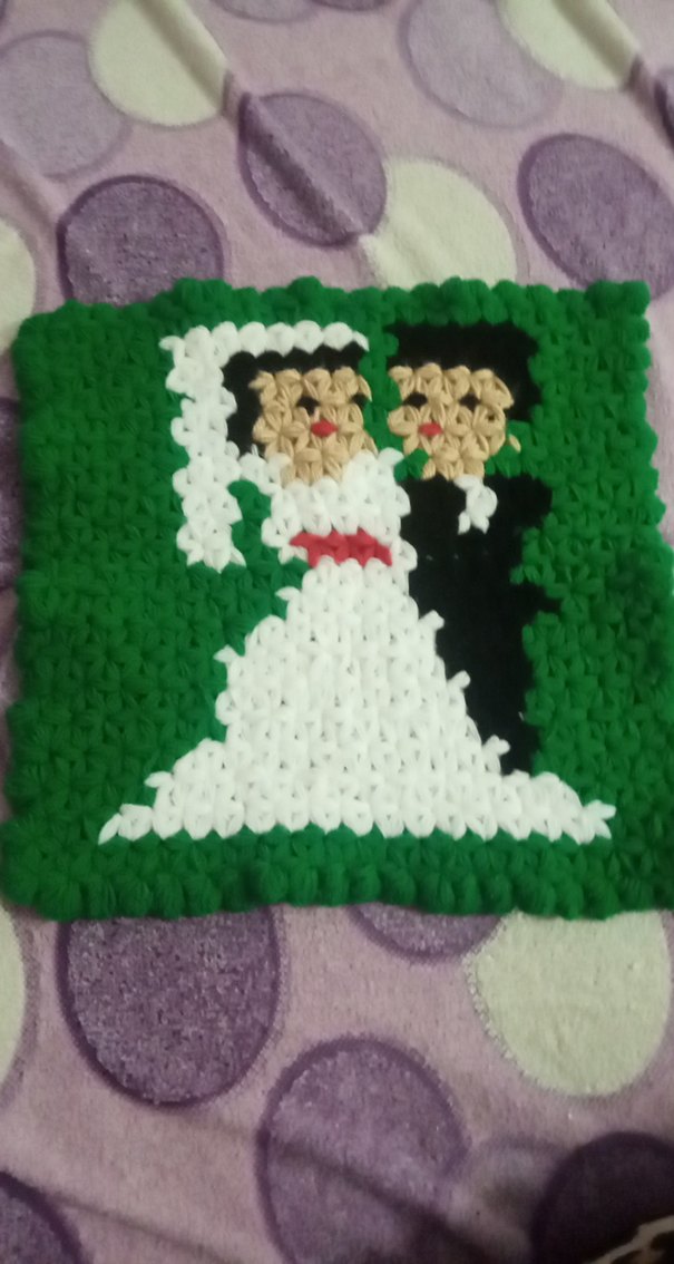 Yeşil zemin üzerine gelin ve damat figürlü renkli, dokulu banyo süngeri.