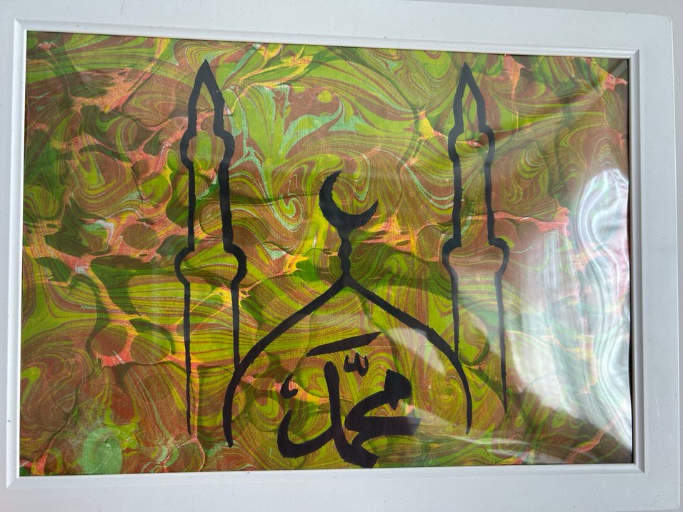 Koyu ve çok renkli ebru desenli arka plan üzerinde siyah minare ve Arapça hat sanatı bulunan tablo. Canlı desenler dinî temaları öne çıkarır. Ebru Sanatı üzerine yapılmış tablo. Ölçüleri 21x30’dur. Kargo deformasyonunu önlemek amacıyla cam değil Pvc çerçeve ile gönderilecektir.