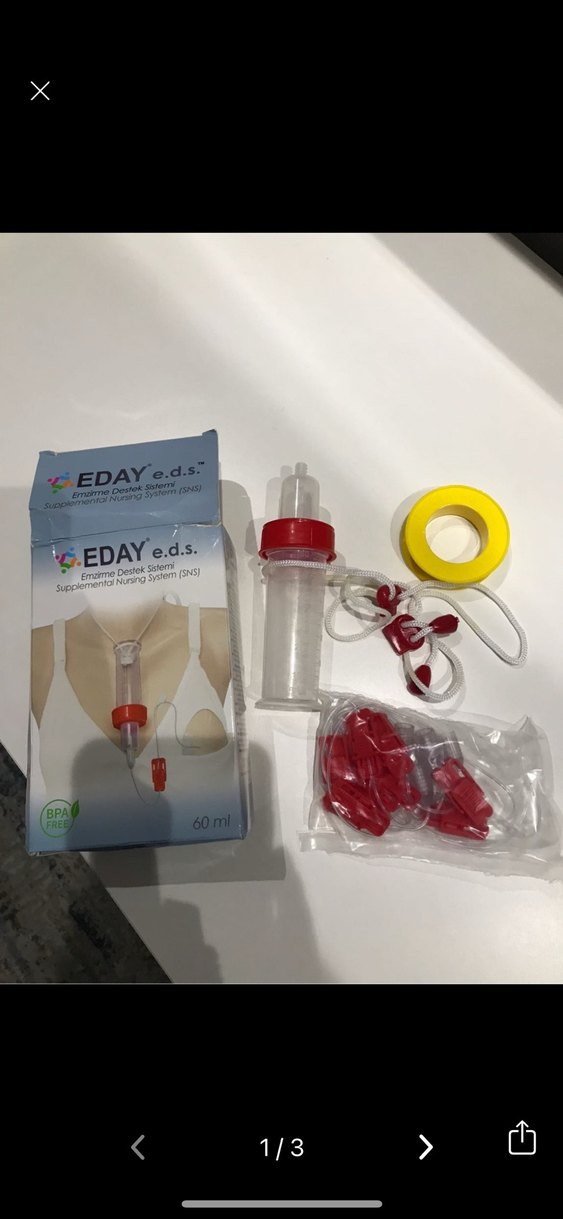 EDAY e.d.s. 60 ml kapasiteli, renkli tasarımlı bebek besleme şişesi ve kırmızı aksesuarlar içerir. BPA içermez.