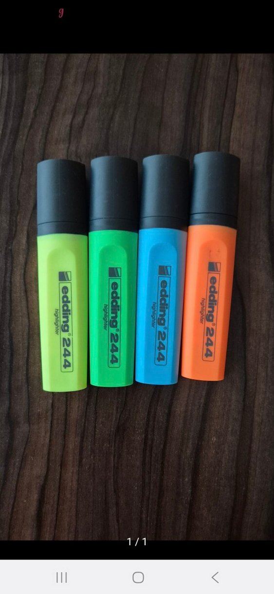 Yeşil, mavi, turuncu ve sarı renkte dört adet renkli Edding 244 fosforlu kalem seti. ️