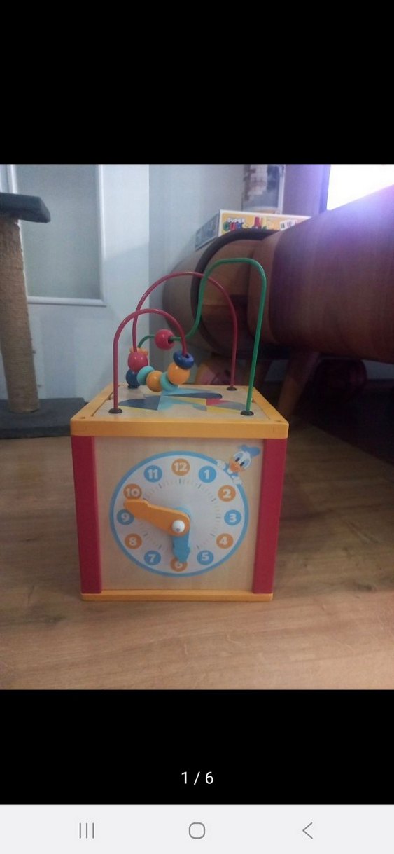 Bu renkli ahşap eğitici küp, hareketli saat ibreleri ve üstte boncuk labirenti telleri ile ince motor becerileri ve saat kavramını geliştirir. 3 tane figürü eksik ama oynamaya engel degil yurt dışından geldi