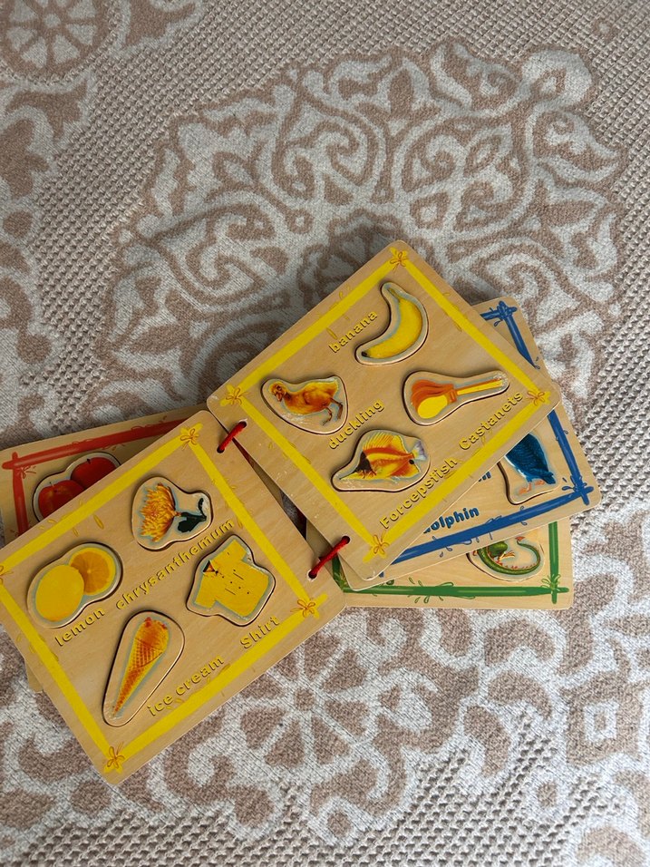 Çeşitli meyve şekilleri ve Fransızca isimleri bulunan renkli ahşap eğitici bulmaca oyuncağıdır.