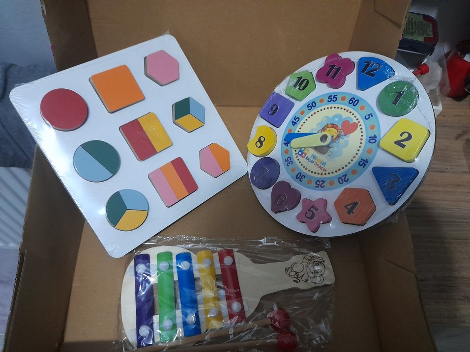 Renkli ahşap eğitici oyuncak seti; şekil eşleştirici, hareketli saat ve beş renkli tuşlu ksilofon içerir. Sıfır ürünler Son fiyatıdır #ahşap #oyuncak