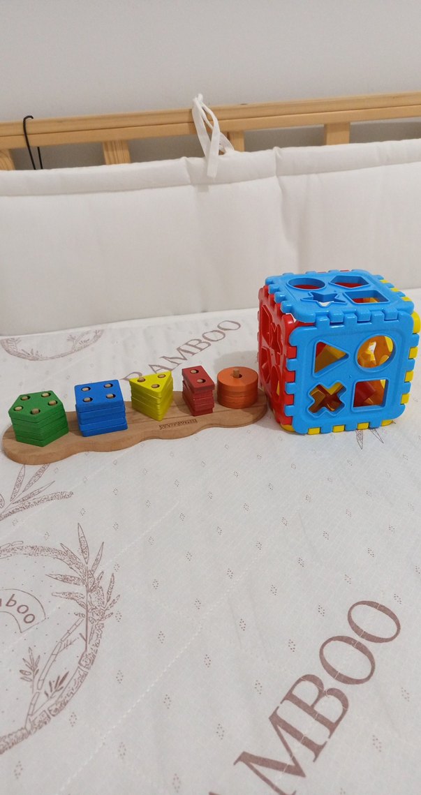 ikili fiyatıdır bu renkli eğitici oyuncak seti, çeşitli geometrik şekilli ahşap yerleştirme ve kesik şekilli plastik küpten oluşur. İnce motor becerileri ve şekil tanımayı geliştirir.