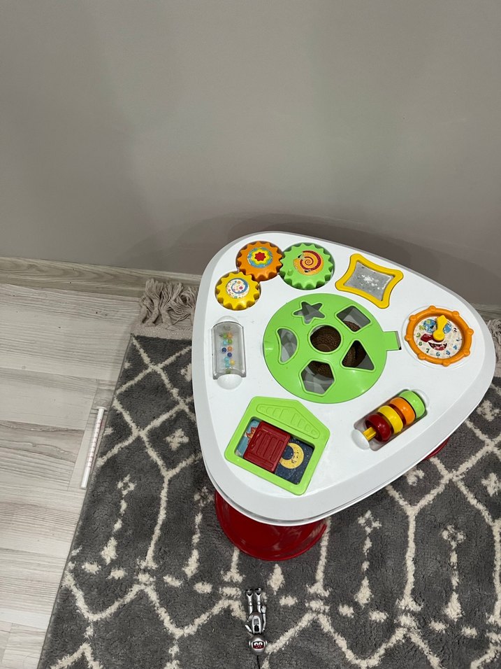 Bu renkli eğitici aktivite masası, dişliler, şekil yerleştirme ve dönen parçalar gibi çeşitli etkileşimli öğeler içerir.