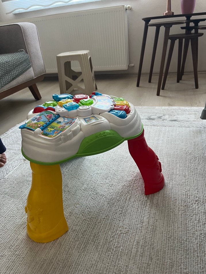 Çocuklar için interaktif düğmeler ve kartlar içeren renkli eğitici aktivite masası.