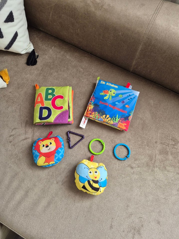 Bu renkli eğitici oyuncak seti, yumuşak alfabe ve deniz temalı kitaplar ile hayvan figürlü peluş oyuncaklar ve halkalar içerir.