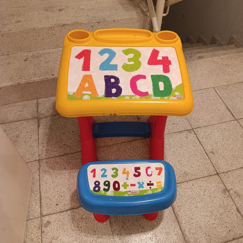Renkli eğitici masa ve sandalye seti, üzerinde 1234, ABCD ve 1234507 sayıları ve harfleri bulunur.