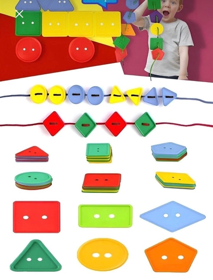 30 parça geometrik şekil ipe dizme Çocukların ince motor becerilerini ve şekil tanımayı geliştiren, çeşitli şekillerde renkli düğmelerden oluşan eğitici oyuncak seti.